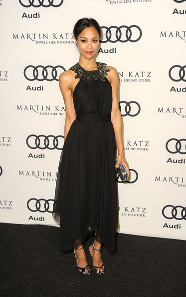 Zoe Saldana looked simply delightful in her black sheer overlay Jason Wu asymmetric hem dress.